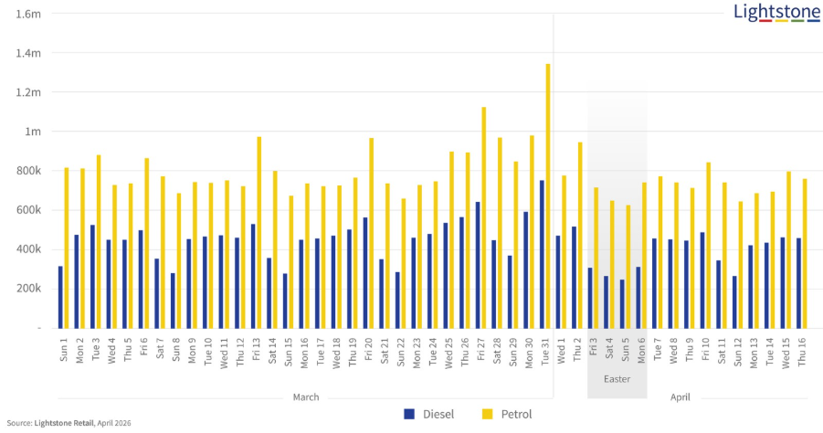 The commercial wave actually started earlier. From 18 March, diesel stops surged as fleet operators, farmers and logistics companies topped up ahead of April. The petrol wave began on Friday 27 March, the day schools closed for the Term 1 break and built steadily into the Tuesday peak.